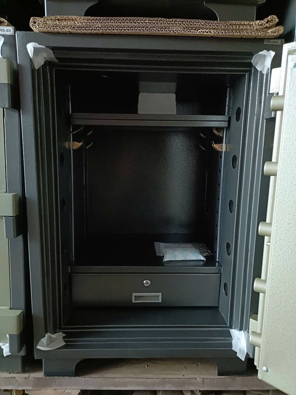 Ngoài ra, két sắt còn được trang bị hệ thống chốt khóa đa điểm bằng thép đặc, giúp chống lại mọi hành vi cạy phá.