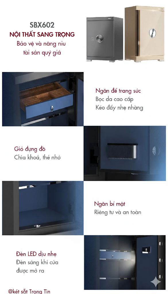 Nội thất: Ngăn chứa bí mật dưới cùng cho phép lưu trữ với không gian tương đối lớn không kém gì các ngăn phía trên. Các khay đựng đồ trang sức ở ngăn két trên được thiết kế tối ưu không gian, giúp lưu trữ và phân loại trang sức một cách tiện lợi. Nội thất ngăn két trên sử dụng chất liệu bọc da cao cấp đảm bảo các món đồ trang sức được nâng niu nhất. Bên cạnh đó két sắt còn thiết kế chân sạc cung cấp hệ thống điện cho két sắt phòng trường hợp hết pin.