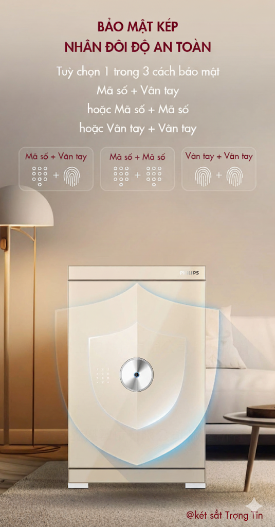 - Bảo mật kép: két chỉ mở khi kết hợp đồng thời vân tay + mật mã.